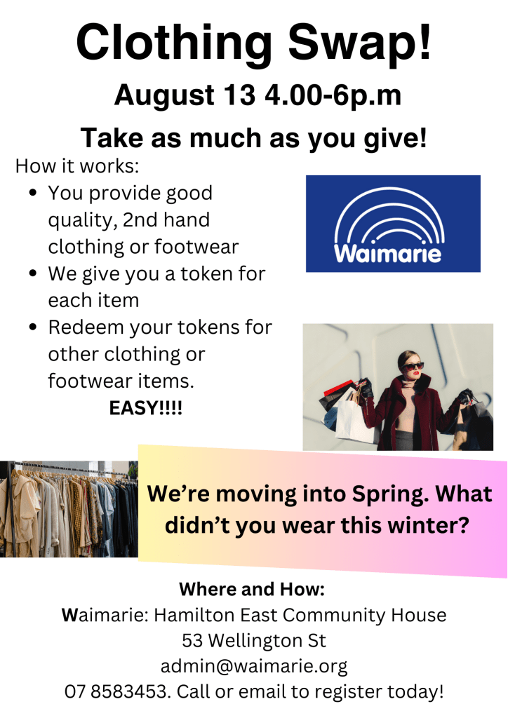 Kia ora. One of the highlights for the year for us has been running Clothing Swaps. The premise is simple; bring in quality used clothing and leave with quality used clothing. Other Community Houses have been running Crop Swaps and we’ll soon join them in that. Again, a simple premise; bring in what you’ve produced and swap it for something others have produced.